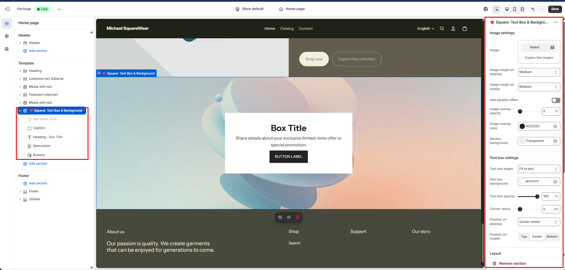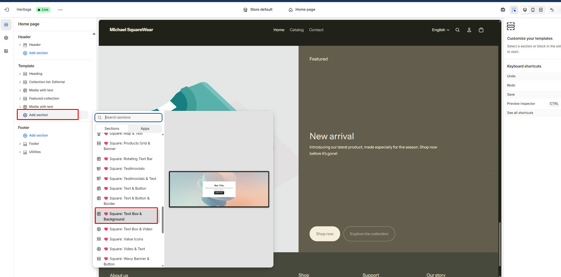 Once you have successfully installed the theme section, you can now go to the Shopify Theme Editor and insert it by clicking Add section > 🩷 Square: Text Box & Background :