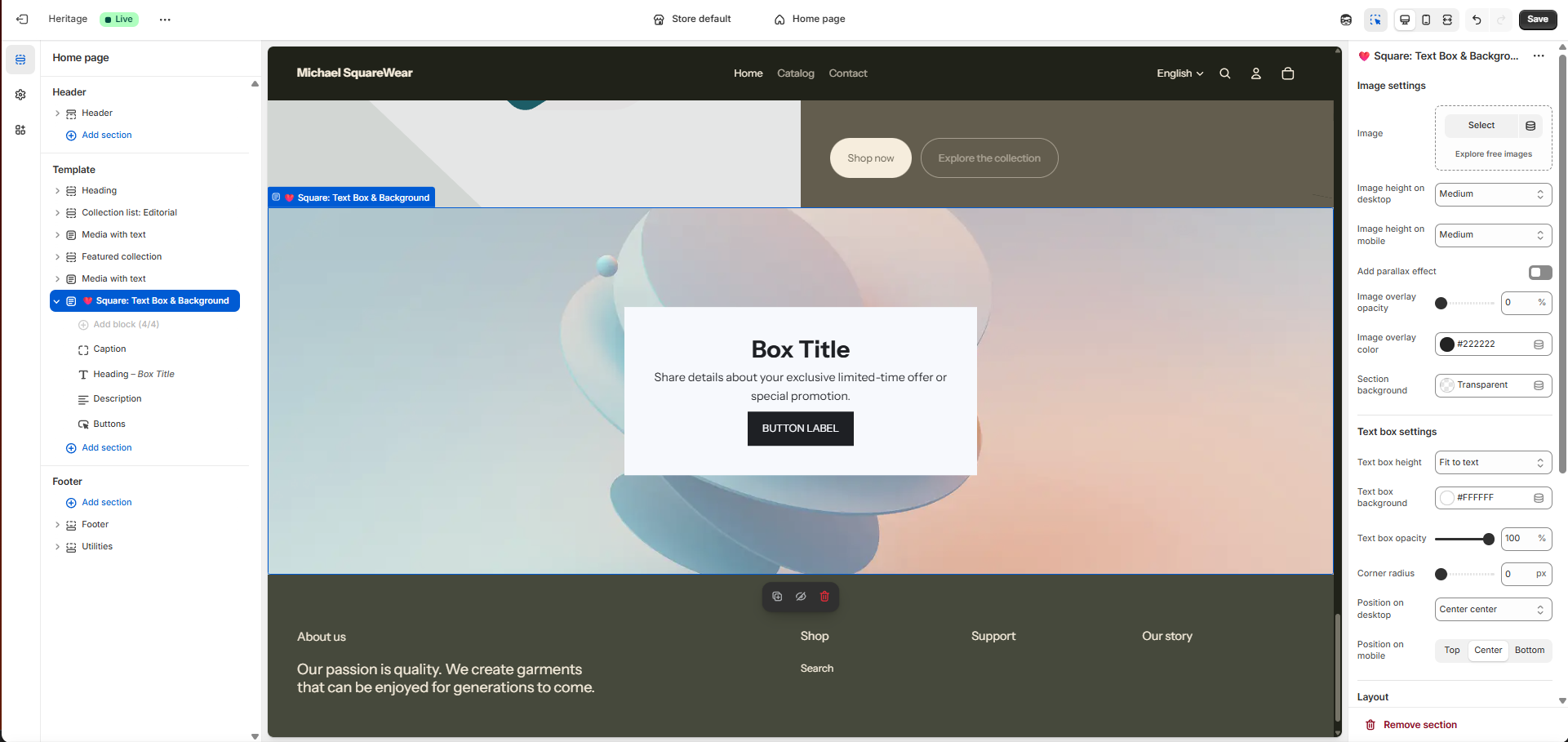 The Text Box & Background section lets you showcase a bold message over an image background — perfect for highlighting promotions, announcements, or brand statements. With customizable layout and styling options, you can tailor the section to seamlessly match your store’s aesthetic.