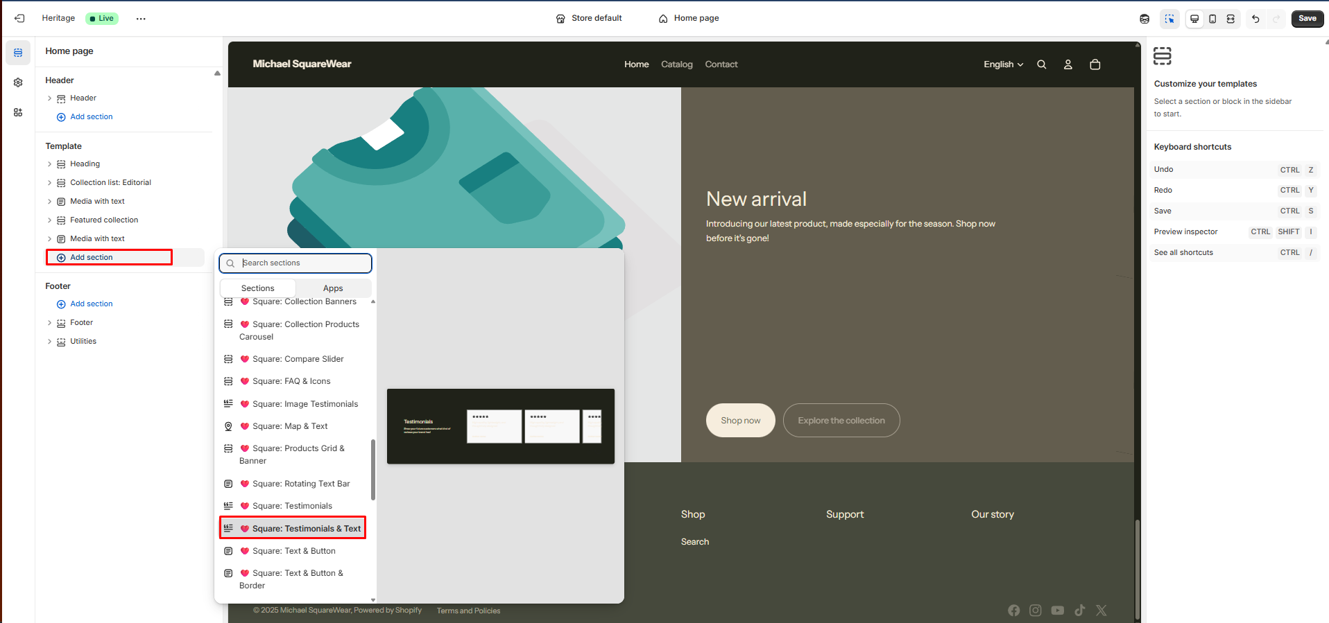 Once you have successfully installed the theme section, you can now go to the Shopify Theme Editor and insert it by clicking Add section > π©· Square: Testimonials and Text :