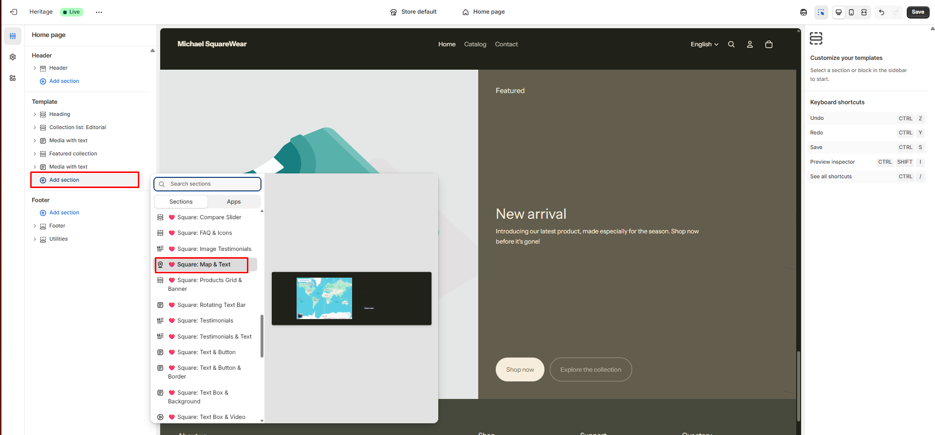Once you have successfully installed the theme section, you can now go to the Shopify Theme Editor and insert it by clicking Add section > 🩷 Square: Map & Text :