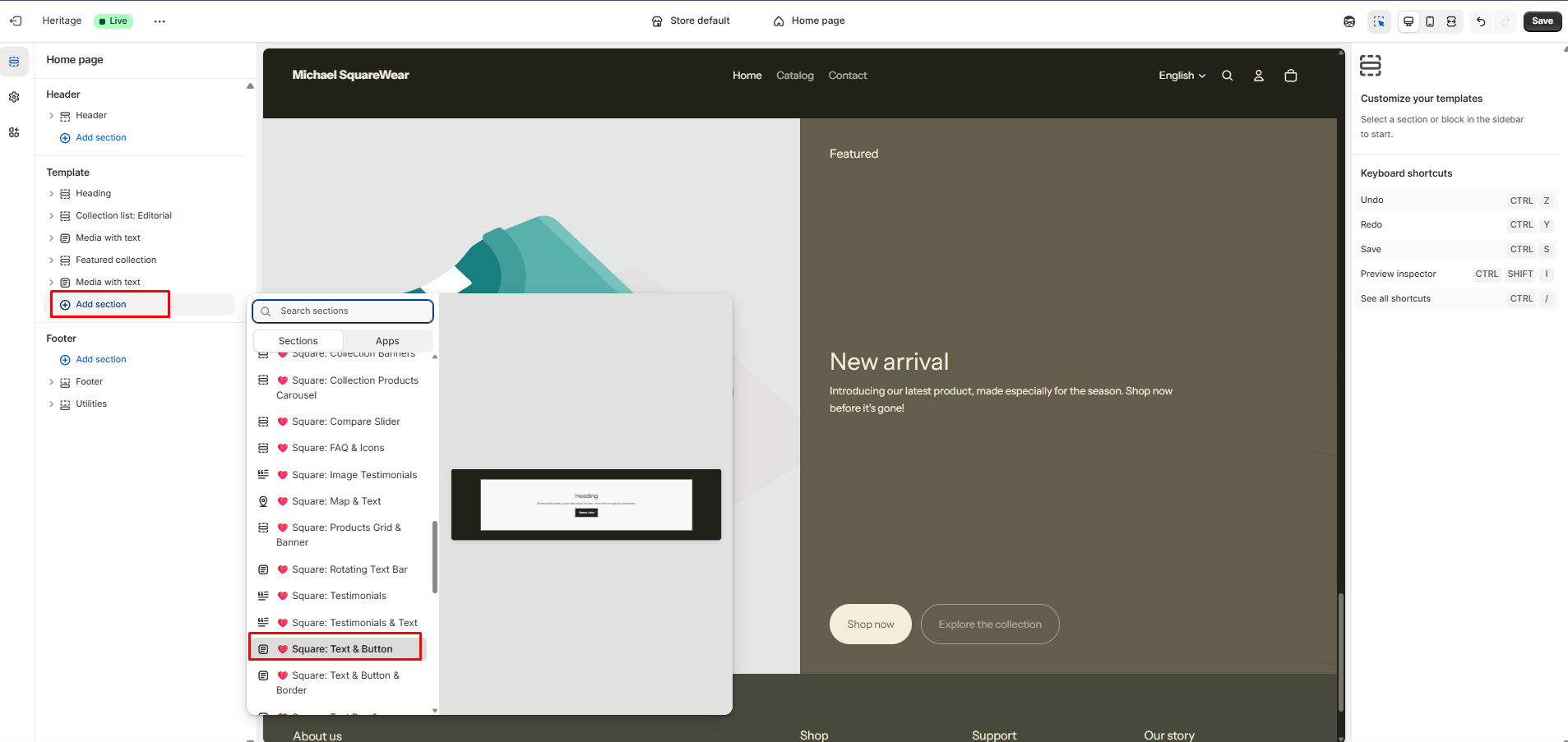 Once you have successfully installed the theme section, you can now go to the Shopify Theme Editor and insert it by clicking Add section > 🩷 Square: Text & Button :